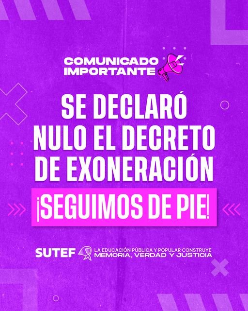 «Este fallo es la confirmación de lo que desde el sindicato hemos planteado desde un inicio. Se deja en claro que en el sumario administrativo que terminó en las expulsiones, no solo del secretario general, sino también de quince compañeros y una compañera docentes, representantes en diferentes estamentos del SUTEF, exonerada/os en ese sumario, no se respetaron normas básicas del DEBIDO PROCESO, negando el legítimo derecho a la defensa.»
