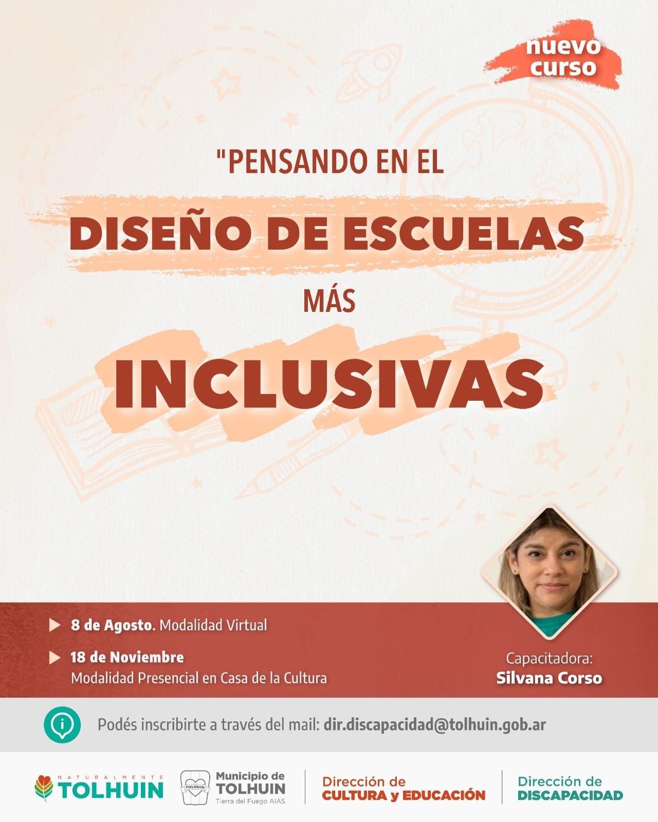 El Municipio de Tolhuin anunció la apertura de inscripciones para la capacitación "Pensando en el Diseño de Escuelas Más Inclusivas", a cargo de la Magister Silvana Corso, experta en Educación Inclusiva y Trastornos del Aprendizaje, entre otros campos.