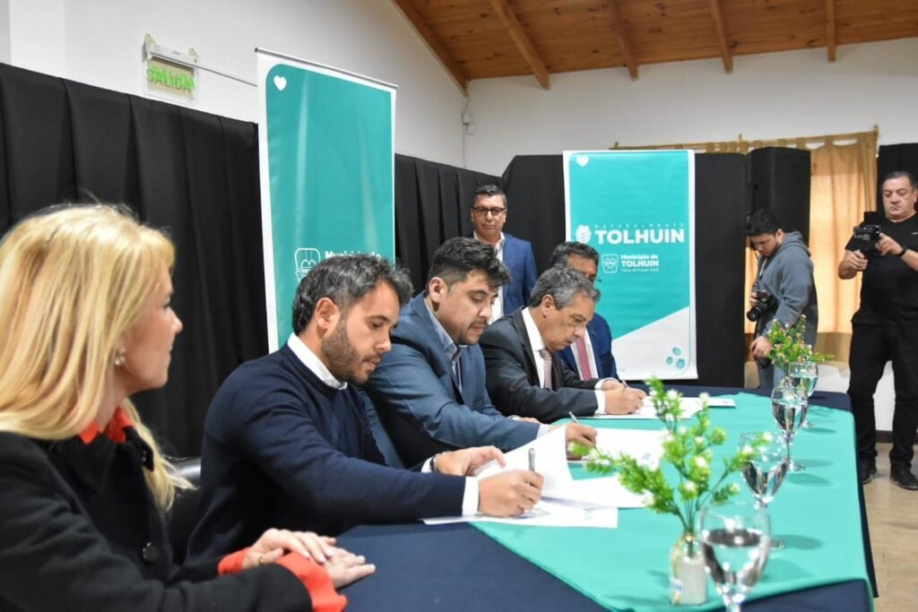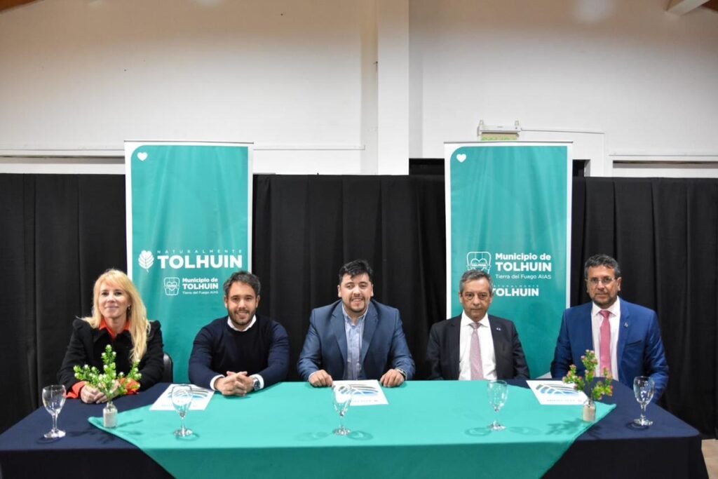 El acuerdo fue firmado por el Intendente de Tolhuin, Daniel Harrington; el Presidente del Banco de Tierra del Fuego, Dr. Fabián Eduardo Musso; y el Presidente del Colegio de Escribanos, Dr. Lautaro de la Riva Moscoso.