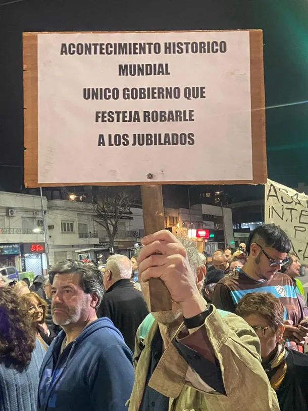 «Acontecimiento histórico mundial: único Gobierno que festeja robarle a los jubilados», dice una de las pancartas en el lugar.