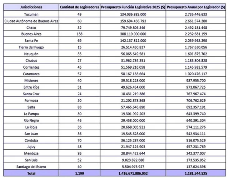 Según el relevamiento Tucumán es la provincia con el mayor gasto anual por legislador, con $2.735 millones, seguida por la Ciudad Autónoma de Buenos Aires ($2.661 millones), Chaco ($2.492 millones) y Buenos Aires ($2.293 millones).