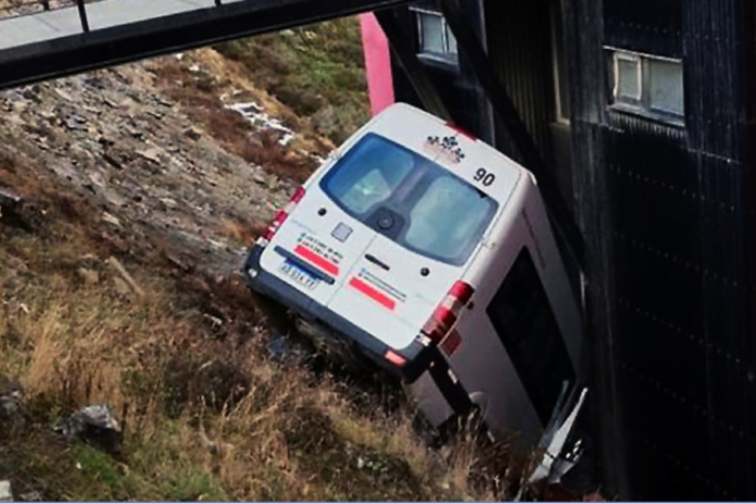 En la mañana de este jueves 11 de julio, alrededor de las 7:30, una camioneta de transporte marca Mercedes modelo Sprinter, de una empresa de transporte de pasajeros, despistó y luego desbarrancó hasta colisionar contra un lado de un edificio.