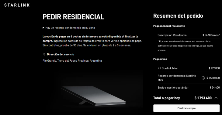Al ingresar a la página oficial de Starlink se puede verificar la disponibilidad para la provincia, y la la instalación está disponible, sin embargo al ingresar lo que encontramos es un cobro de un pago único que icluye: $ 189.000 del Kit Starlin Mini, $ 24.400 de envío y gestión, y otros $ 1.580.000 que es un recargo por la demanda.