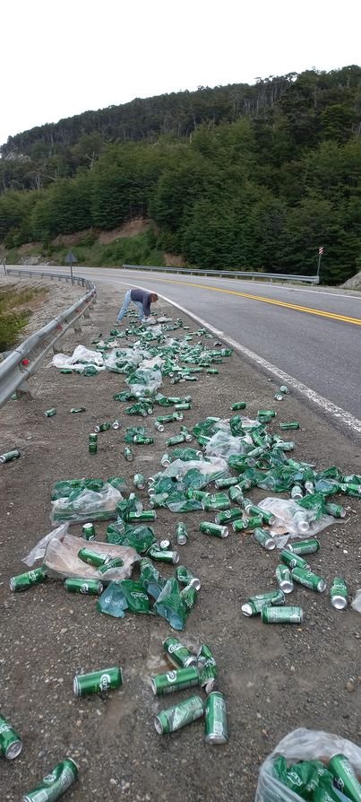 Lo que desconocían es que el motivo de esta curiosa presencia en la ruta fue el despiste que sufrió el martes por la tarde un vehículo que transportaba estas latas con destino comercial a la ciudad de Ushuaia.