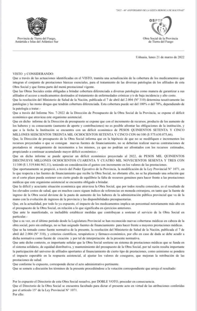 La Obra Social de la Provincia de Tierra del Fuego (OSPTF) emitió horas atrás un comunicado y se refirió a la resolución 46/22 de directorio adoptada el pasado lunes 21 de marzo, donde se tomaron diversas medidas en términos de cobertura de los afiliados que comenzarán a ser efectivas a partir de la semana que viene.