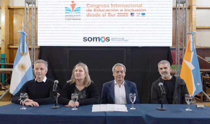 La ministra Judit Di Giglio y el presidente de FEPRA, Marcelo Clingo, firmaron un convenio marco para fortalecer las políticas de salud mental comunitaria, con especial foco en la protección de niñas, niños y adolescentes, durante el 7° Congreso Internacional de Educación e Inclusión desde el Sur realizado en la Escuela Nº 13 de Ushuaia.