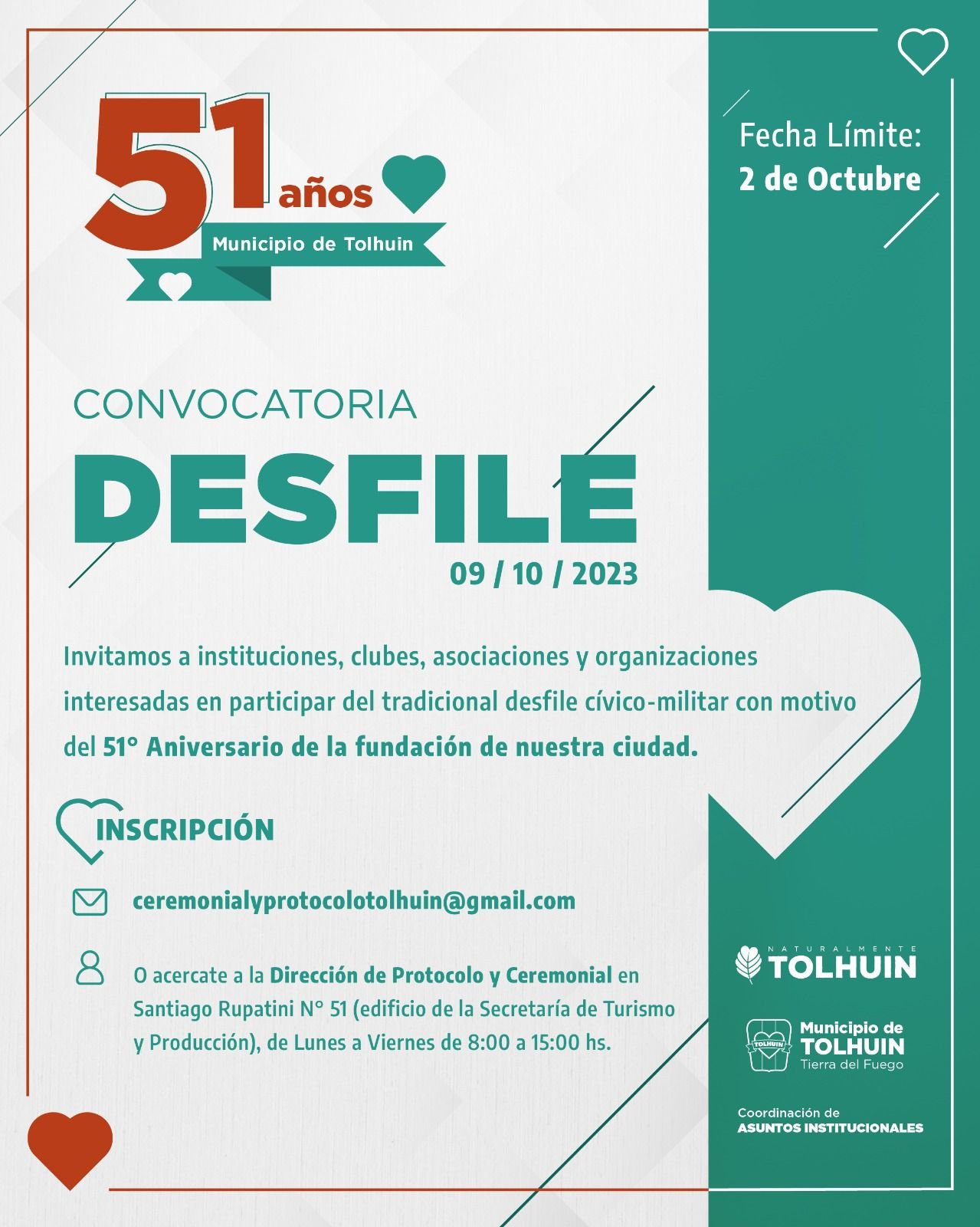 La convocatoria estará abierta hasta el día 2 de octubre y los interesados deberán enviar un mail a ceremonialyprotocolotolhuin@gmail.com o bien personalmente en la Dirección de Protocolo y Ceremonial, ubicada en Calle Santiago Rupatini N° 51 (Edificio de la Secretaría de Turismo y Producción), de lunes a viernes de 8:00 a 15:00 hs.