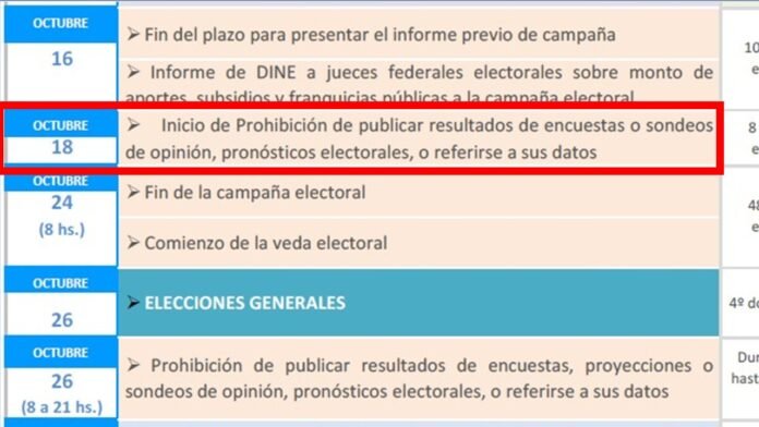 La denuncia surge luego de que dirigentes de Fuerza Patria difundieran materiales gráficos con supuestos resultados de intención de voto y mensajes políticos que buscan influir en el electorado, pese a que la veda de encuestas comenzó el 18 de octubre, según el cronograma oficial de la Dirección Nacional Electoral (DINE).