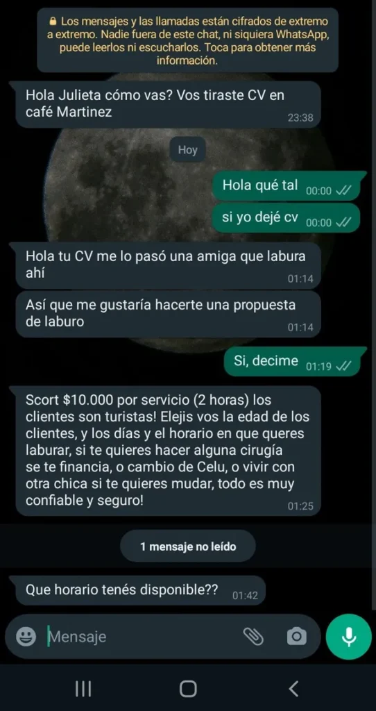 «Hola, tu CV me lo pasó una amiga que labura ahí. Asi que me gustaría hacerte una propuesta de laburo», le escribieron a @jeongicide2 luego de dejar su currículum en un local de Café Martínez. «Scort $10.000 por servicio (dos horas). Los clientes son turistas. Elegís vos la edad de los clientes y los días y el horario que querés laburar. Si te querés hacer alguna cirugía se te financia, o el cambio de celu o vivir con otra chica si te querés mudar. Todo es muy confiable y seguro», agregó.