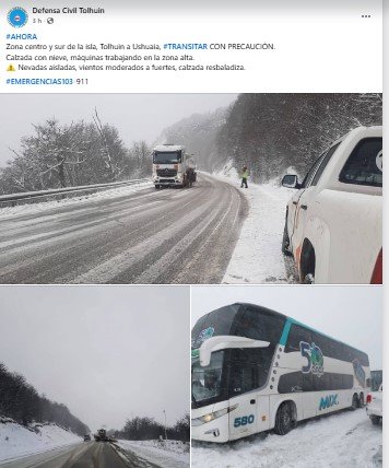 Si bien ya cayendo la tarde las condiciones adversas amenguaron, se solicita a los automovilistas transitar con suma precaución. Según se informa desde DC Tolhuin, en la zona centro y sur la calzada se presenta con nieve y máquinas trabajando en la zona alta.