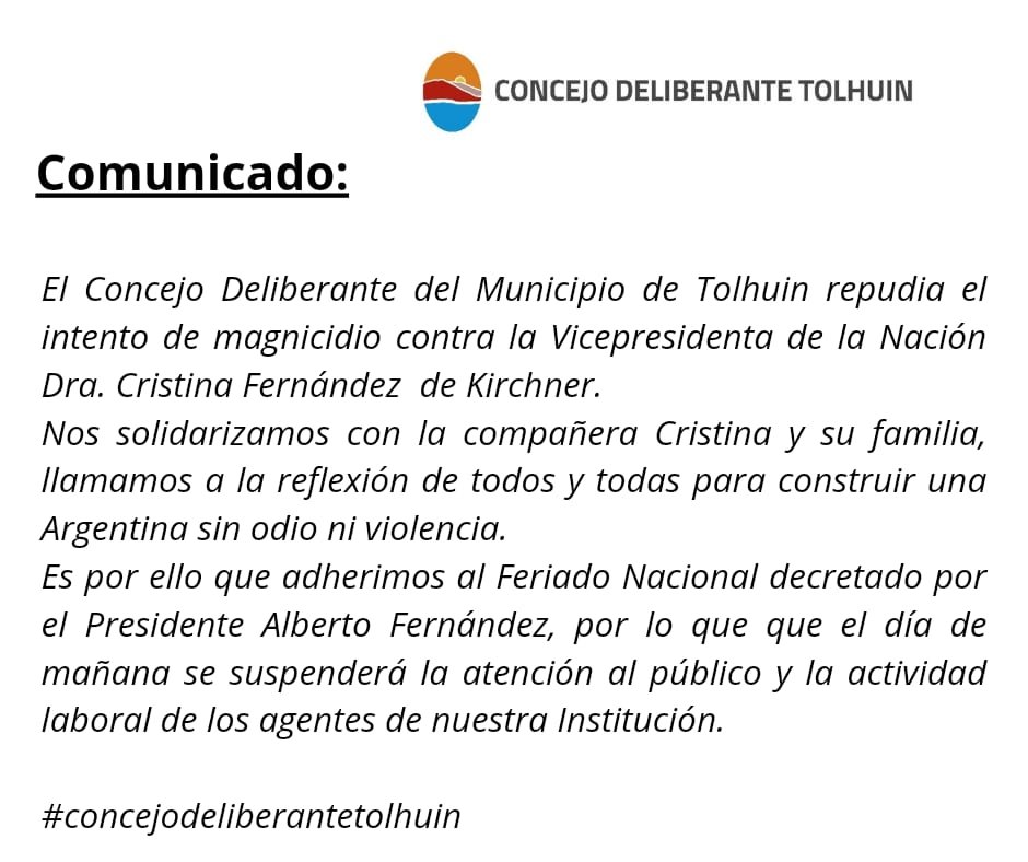 InicioLocalesEl Consejo Deliberante de Tolhuin repudia el atentado a la Señora Vicepresidenta...LocalesEl Consejo Deliberante de Tolhuin repudia el atentado a la Señora Vicepresidenta Cristina Kirchner y adhiere al al Feriado Nacional para el dia de hoy.Publicada en2 de septiembre de 2022Por kaminoticiasFacebookXPinterestWhatsApp Últimos Articulos JudicialesAllanan la casa de Suárez Mason en busca de archivos de la dictadura El juez federal Daniel Rafecas allanó la casa en la que vivía Carlos Guillermo Suárez Mason, jefe... 13 de abril de 2026 ConcejoEL CONCEJO DELIBERANTE CONFORMÓ LAS SALAS DE JUICIO POLÍTICO En ese marco, se llevó adelante el sorteo para la conformación de las Salas... 13 de abril de 2026 GremialesNo olvidamos ni perdonamos ¡Victor Choque presente! “A 31 años del asesinato de Víctor Choque, primer trabajador muerto en democracia por... 13 de abril de 2026 GuerraDonald Trump tildó de «débil y terrible» al Papa y León XIV respondió: «No le temo» El papa León XIV afirmó que no tiene “ningún temor a la administración Trump”... 13 de abril de 2026 Más Noticias JudicialesAllanan la casa de Suárez Mason en busca de archivos de la dictadura El juez federal Daniel Rafecas allanó la casa en la que vivía Carlos Guillermo Suárez Mason, jefe... 13 de abril de 2026 ConcejoEL CONCEJO DELIBERANTE CONFORMÓ LAS SALAS DE JUICIO POLÍTICO En ese marco, se llevó adelante el sorteo para la conformación de las Salas... 13 de abril de 2026 GremialesNo olvidamos ni perdonamos ¡Victor Choque presente! “A 31 años del asesinato de Víctor Choque, primer trabajador muerto en democracia por... 13 de abril de 2026