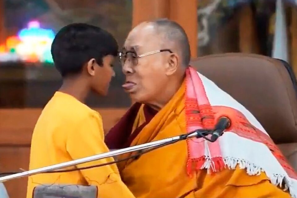 Segundos después, el líder tibetano se da vuelta, queda frente a frente con el niño y con los dedos le muestra los labios para, acto seguido, agarrarlo y besarlo en la boca.