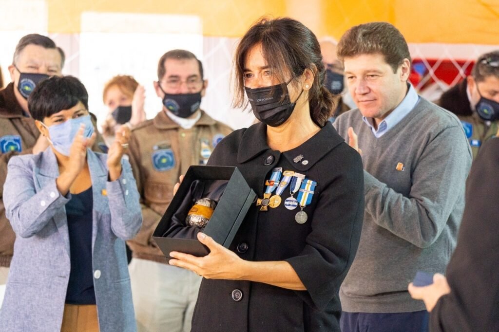 Durante el acto, el Gobernador Melella, la Vicegobernadora Urquiza, la Ministra Cubino y Veteranos de Guerra entregaron a las directoras del establecimiento la imagen bordada de las Islas Malvinas que los alumnos lucirán en sus guardapolvos, según Ley 1392 “Ley Thiago Nahuel”. Las autoridades también entregaron un reconocimiento a la Veterana de Malvinas Mariana Soneira, quien durante el conflicto se desempeñó como telégrafa del Bahía San Blas, un buque encargado de tareas logísticas que llevaban armamento y otros elementos a las tropas argentinas. De este modo se conmemoró la labor de las 16 mujeres que participaron de la guerra.