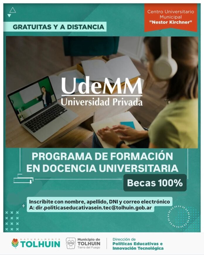 El Municipio de Tolhuin, a través de la Dirección de Políticas Educativas e Innovación Tecnológica, anunció una nueva convocatoria para docentes y profesionales de toda la provincia que deseen capacitarse de manera gratuita y virtual. La propuesta forma parte de un convenio con la Universidad de la Marina Mercante y busca fortalecer el desarrollo profesional, brindando herramientas actualizadas para quienes enseñan, guían o quieren formarse en distintas áreas humanas, técnicas y culturales.