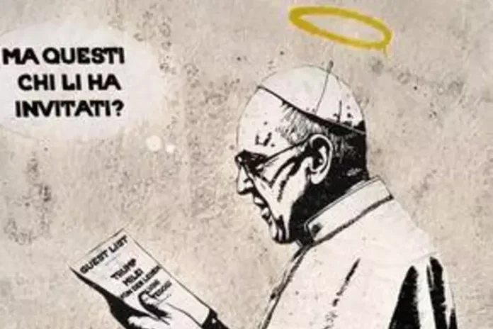 En el mural puede observarse al papa Francisco con una «lista de invitados» en su mano, a la que observa fijamente mientras se pregunta: «¿Pero quién invitó a estos?». Los nombres que llegan a leerse en el listado, además de Donald Trump y Javier Milei, son los de Úrsula Von der Leyen,titular de la Comisión Europea, Matteo Salvini, vicepresidente del Consejo de Ministros de la República Italiana, y Matteo Piantedosi, ministro del Interior italiano.
