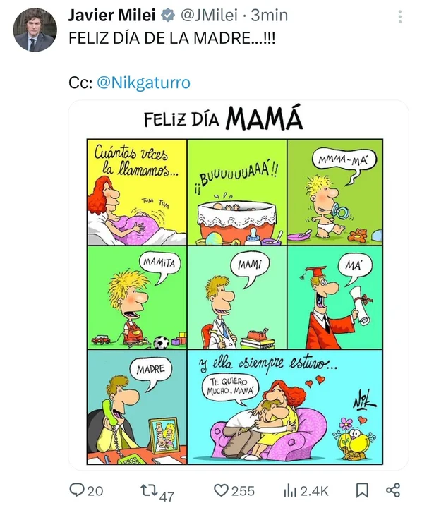 Sin embargo, en lugar de publicar una foto junto a su madre o un mensaje personal, el mandatario eligió compartir una viñeta del personaje Gaturro, creado por el dibujante libertario Nik.