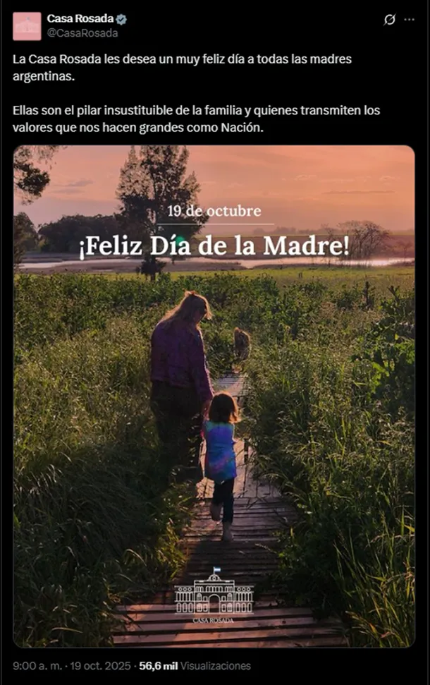 Javier Milei también compartió el posteo de la efemérides que realizó la cuenta oficial de la casa de gobierno en X: «La Casa Rosada les desea un muy feliz día a todas las madres argentinas. Ellas son el pilar insustituible de la familia y quienes transmiten los valores que nos hacen grandes como Nación», señala el posteo.