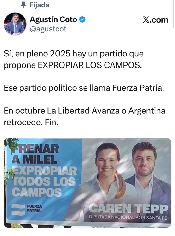 “Sí, en pleno 2025 hay un partido que propone EXPROPIAR LOS CAMPOS. Ese partido político se llama Fuerza Patria. En octubre La Libertad Avanza o Argentina retrocede. Fin.”