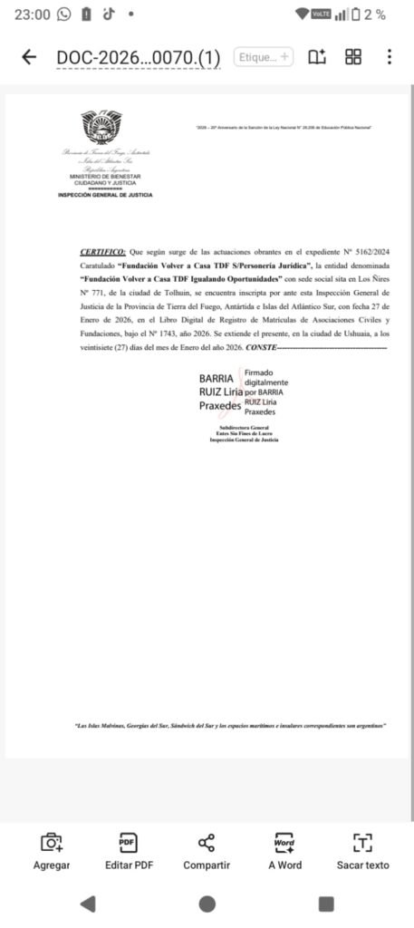 Con enorme emoción, decimos que la «Fundación Volver a Casa Igualando Oportunidades» se encuentra inscripta por ante la Inspección General de Justicia de la Provincia de Tierra del Fuego, Antártida e Islas del Atlántico Sur, con fecha 27 de Enero de 2026, en el Libro Digital de Registro de Matrículas de Asociaciones Civiles y Fundaciones, bajo el Nº 1743, año 2026.