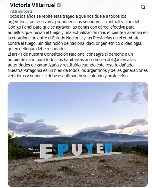 Villarruel devolvió el dardo con un posteo en el que anticipó que les pedirá a los senadores que endurezcan las penas para quienes inician el fuego. «Sin distinción de nacionalidad, origen étnico o ideología, quien delinque debe responder», dijo en una chicana contra Bullrich, que volvió a acusar a los mapuches de haber incendiado la Patagonia.