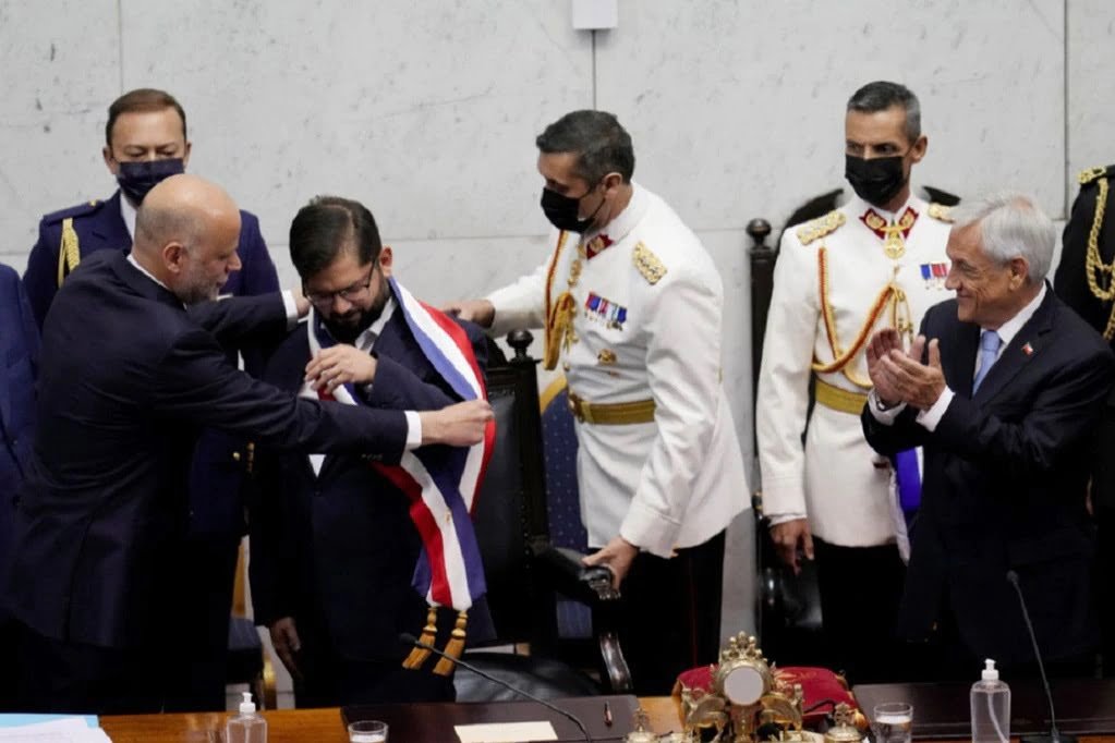 Ante un plenario que lo ovacionaba de pie, el flamante jefe de Estado -visiblemente emocionado- recibió con una sonrisa la banda presidencial y la mítica piocha de OHiggins -símbolos del traspaso de poder- de manos del presidente del Senado, el socialista Álvaro Elizalde, y del mandatario saliente, el conservador Sebastián Piñera, respectivamente.