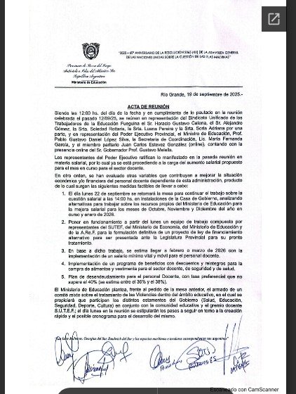«1. El día lunes 22 de septiembre se retomará la mesa para continuar el trabajo sobre la cuestión salarial a las 14:00 hs. en instalaciones de la Casa de Gobierno, analizando alternativas para trabajar sobre los recursos propios del Ministerio de Educación para la mejora salarial para los meses de Octubre, Noviembre y Diciembre del año en curso y enero de 2026.