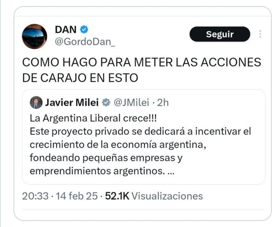 «La Argentina Liberal crece!!! Este proyecto privado se dedicará a incentivar el crecimiento de la economía argentina, fondeando pequeñas empresas y emprendimientos argentinos. El mundo quiere invertir en Argentina», decía el tuit de Milei, publicado a las 19:01 del viernes con dos links: uno a la página de $LIBRA; el otro era el tag del token promocionado.