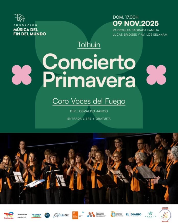Bajo la dirección de Osvaldo Janco, se presentará el Coro Voces del Fuego. La cita será el domingo 9 de Noviembre, a las 17.00 horas, en la Parroquia Sagrada Familia, ubicada en Lucas Bridges y Av. Los Selknam.