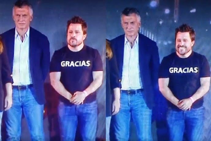Mientras hablaba la primera candidata a diputados por la Ciudad, María Eugenia Vidal, se observa cómo Macri extiende su mano por detrás del economista, quien solo atina a reírse. El ex presidente se mantuvo inmutable.