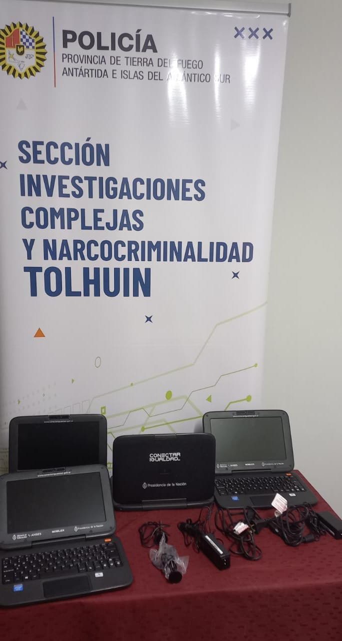 Parte Policíal:En la fecha (04 de Mayo), y luego de una intensa investigación llevada adelante por personal de la Sección Investigaciones Complejas y Narcocrimalidad Tolhuin, dichos efectivos policiales procedieron al secuestro de Cuatro (04) computadoras del programa Conectar Igualdad que fueran sustraídas en fecha 16 de Abril del Colegio Ramon Alberto Trejo Noel. De momento no se puede brindar mayores datos al respecto en virtud a que la investigación prosigue a fin de recuperar los dos (02) equipos informáticos restantes.