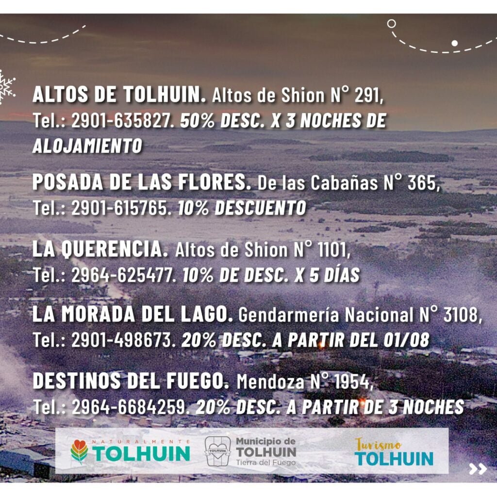 El Municipio de Tolhuin, a través de la Secretaría de Turismo y Producción, relanzó el programa "Invierno con Vos" para la edición 2024, con el objetivo de fomentar el turismo invernal en la región y brindar a los residentes y visitantes de otras provincias la oportunidad de disfrutar de descuentos y beneficios en una variedad de productos y servicios.