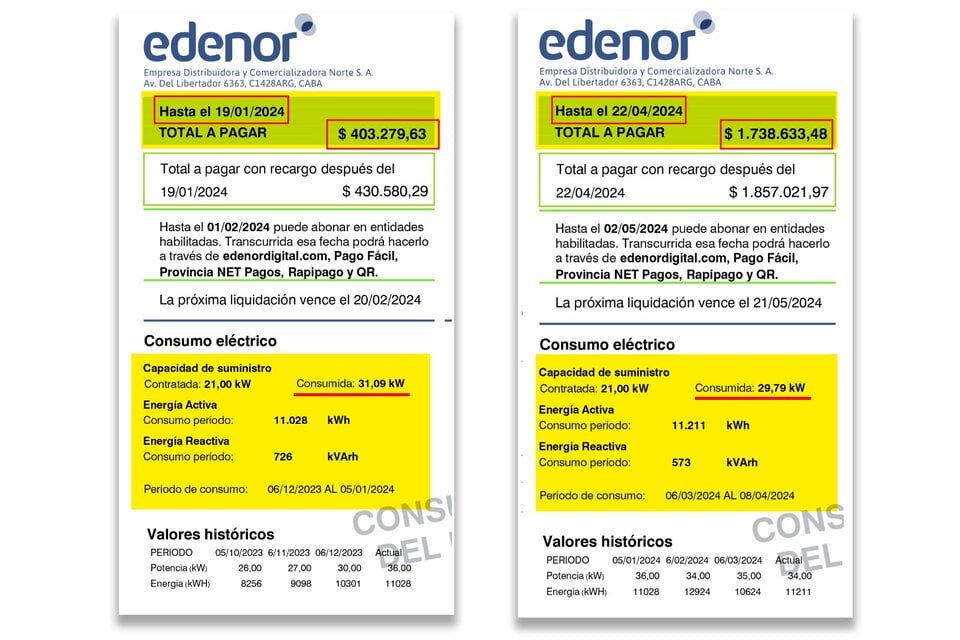 Un cliente de Edenor del barrio de Colegiales, en la Ciudad de Buenos Aires, que pagó una factura de 15 mil pesos en febrero pasó a pagar 29 mil en marzo y 90 mil en abril. Estas últimas dos boletas son de la misma medición bimestral, pero la segunda, la de abril, ya contiene el impacto pleno del tarifazo de la electricidad que aplicó el Gobierno desde el 1 de febrero. Otra usuaria, en Villa Lynch, vio crecer la factura de 34 mil pesos en marzo a 119 mil en abril, en la misma medición bimestral, con un consumo de 652 kw. La segunda boleta, la de 119 mil, es la que incluye toda la suba de la tarifa. Un tercer usuario de Edesur, de Lomas de Zamora, pagó 25 mil pesos en marzo y 81 mil en abril.