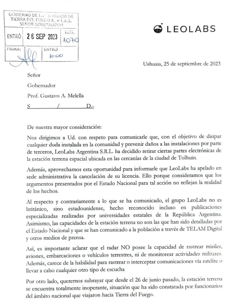 Asimismo, LeoLabs Argentina SRL puso en conocimiento al Gobernador Melella que una vez finalizado el retiro de la electrónica del radar, entre otros puntos, solicitará a la Dirección de Energía el corte total del suministro de energía, modificará la estructura societaria y solicitará al Ministerio de Producción y Medio Ambiente la suspensión de plazos procesales hasta tanto se resuelva de manera definitiva el planteo que ha realizado a nivel nacional, relacionado con la cancelación de su autorización para funcionar.