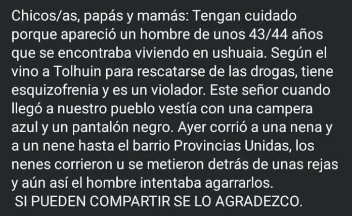 La Policía de Tolhuin desmintió las versiones que circulaban en redes sociales sobre un supuesto caso de un adulto persiguiendo a menores en la vía pública. La denuncia, que había generado preocupación en la comunidad local, fue investigada por las autoridades con la intervención del Juzgado local, pero los hechos finalmente resultaron ser una falsa alarma.