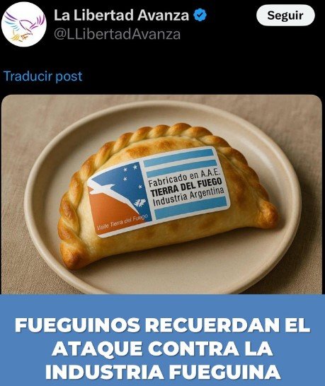 Se renueva la polémica que sacudió las redes sociales y el debate político en Tierra del Fuego. La cuenta oficial del partido La Libertad Avanza (LLA) en la plataforma X (ex Twitter) publicó el 26 de mayo de este año la imagen de una empanada con una etiqueta que decía: “Industria Argentina, Fabricado en A.A.E. Tierra del Fuego”, en abierta alusión al régimen de promoción económica vigente en la provincia más austral del país.