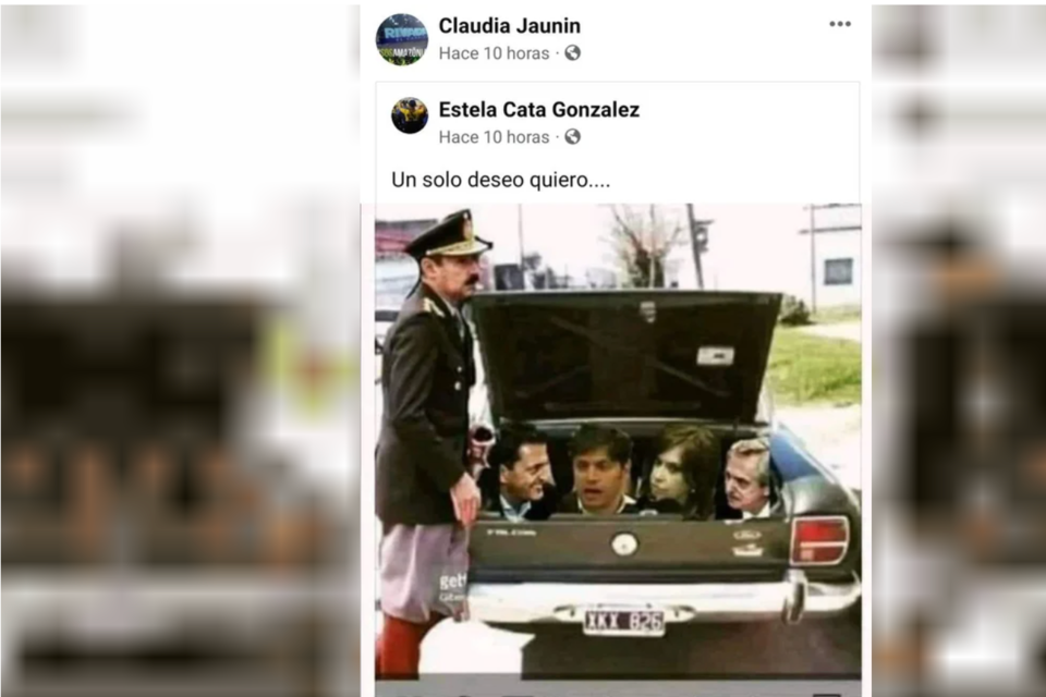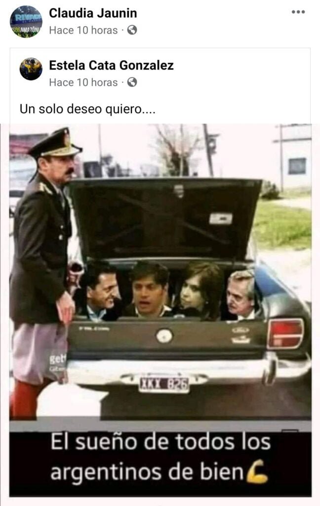 En el posteo que compartió la funcionaria en Facebook, y que luego borró, se ve una imagen con las figuras del presidente Alberto Fernández, la vicepresidenta Cristina Kirchner, el gobernador bonaerense Axel Kicillof y el presidente de la Cámara de Diputados, Sergio Massa en el baúl de un Falcon verde, auto que la dictadura utlizaba para secuestrar personas, junto a la figura del exmandatario de facto Jorge Rafael Videla. La imagen lleva la leyenda “el sueño de todos los argentinos de bien».