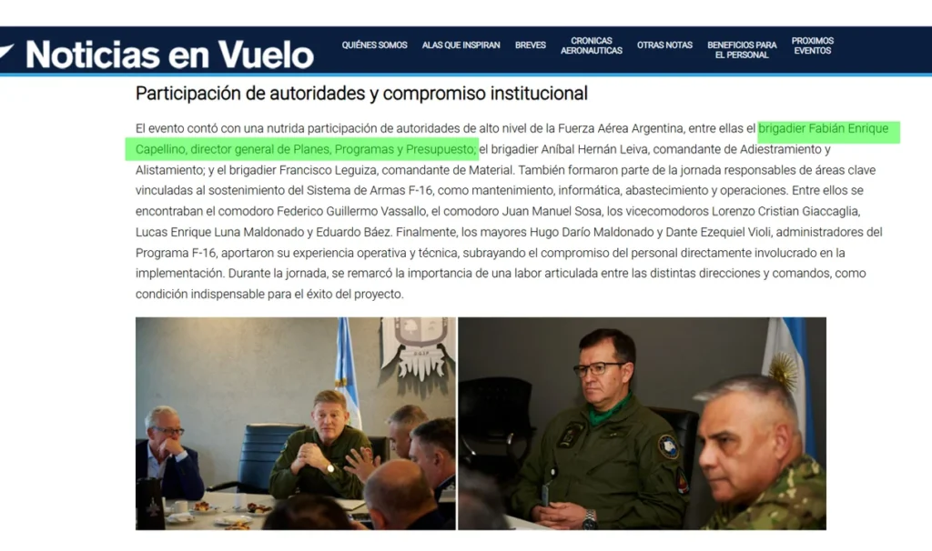 “El evento contó con una nutrida participación de autoridades de alto nivel de la Fuerza Aérea Argentina, entre ellas el brigadier Fabián Enrique Capellino, director general de Planes, Programas y Presupuesto; el brigadier Aníbal Hernán Leiva, comandante de Adiestramiento y Alistamiento; y el brigadier Francisco Leguiza, comandante de Material”, concluyen.
