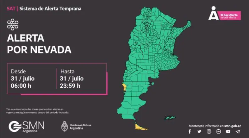 El SMN emitió otro alerta amarillo por nevadas persistentes para la cordillera de Chubut y gran parte de Tierra del Fuego. El área será afectada por nevadas persistentes, algunas localmente fuertes en la noche de este lunes.