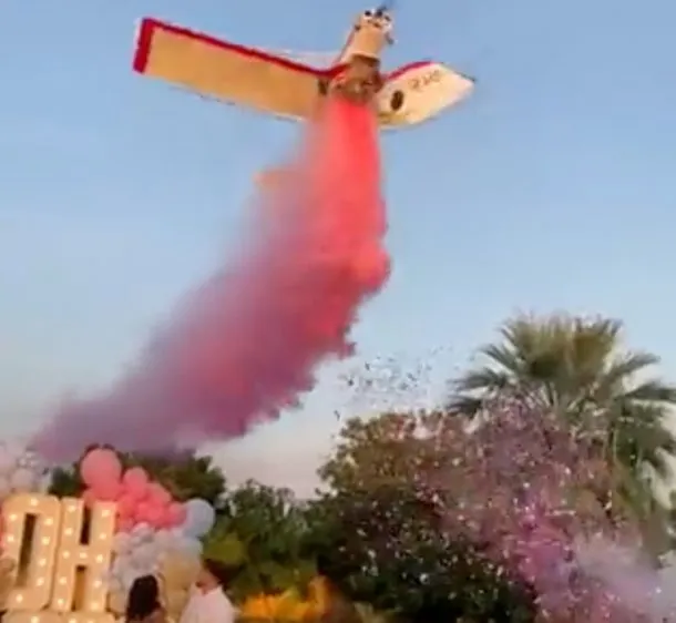 La aeronave debía pasar por encima de la pareja y lanzar humo rosa para anunciar que es una niña la que está en camino, pero se le rompió una de sus alas y terminó cayendo.