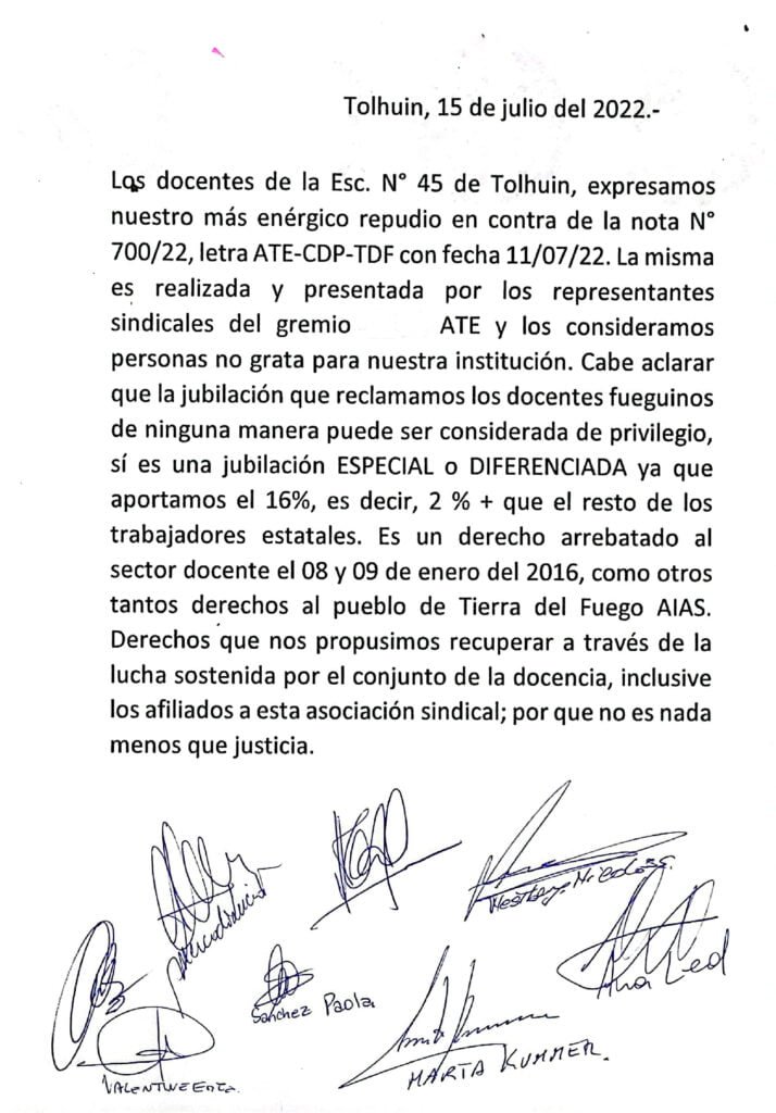 La docencia de la Escuela Nro. 45 de Tolhuin repudia el accionar de los representantes sindicales del gremio ATE.