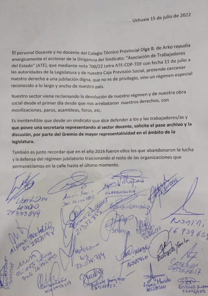 Personal Docente y No Docente del Colegio Técnico Provincial Olga B. de Arko y la Esc. 45 de Tolhuin repudian enérgicamente el accionar de la dirigencia de ATE