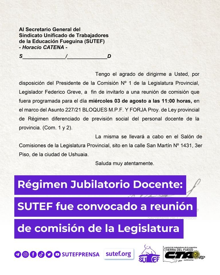 La Legislatura Provincial convocó al SUTEF a reunión de comisión el día miércoles 03 de agosto a las 11:00 horas, en el marco del Asunto 227/21 anteproyecto del Régimen Diferencial de Jubilaciones para el personal Docente de la provincia de Tierra del Fuego AIAS, presentado por nuestra organización para recuperar el régimen jubilatorio el 21 de abril del 2021.
