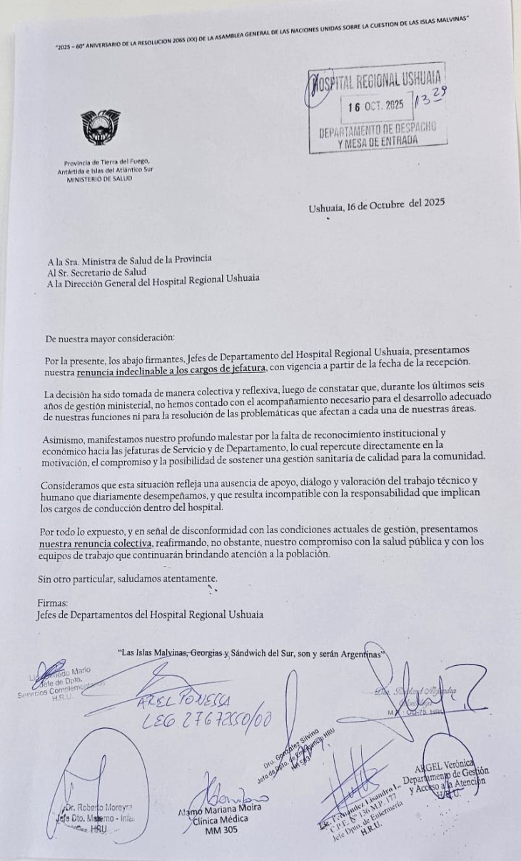 La carta lleva las firmas de los principales jefes de Departamento del Hospital Regional Ushuaia, entre ellos Mario Estévez (Servicios Complementarios), Abel Fonseca (Clínica Médica), Roberto Moreyra (Internación), Silvina González (Emergencias), Mariana Moira Álamo (Clínica Médica) y Verónica Áhgel (Gestión y Acceso a la Atención), entre otros.