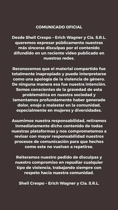 “Somos conscientes de la gravedad de esta problemática en nuestra sociedad y lamentamos profundamente haber generado dolor, enojo o malestar en la comunidad, especialmente en mujeres y diversidades”, agrega el texto de la compañía.