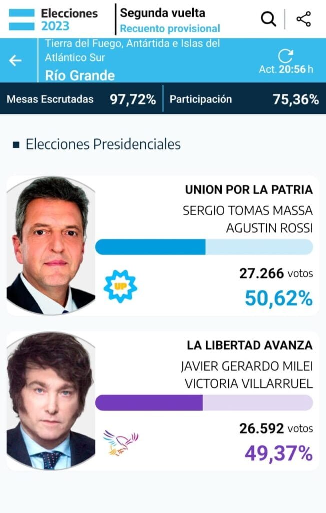 Río Grande, 19 de noviembre del 2023.- Así lo demuestran los datos de la Cámara Nacional Electoral, con el 97, 72% y una participación del 75,36%, el candidato Sergio Tomás Massa fue el más votado en Río Grande, con 27.266 votos. En Ushuaia y Tolhuin, la performance fue completamente diferente.