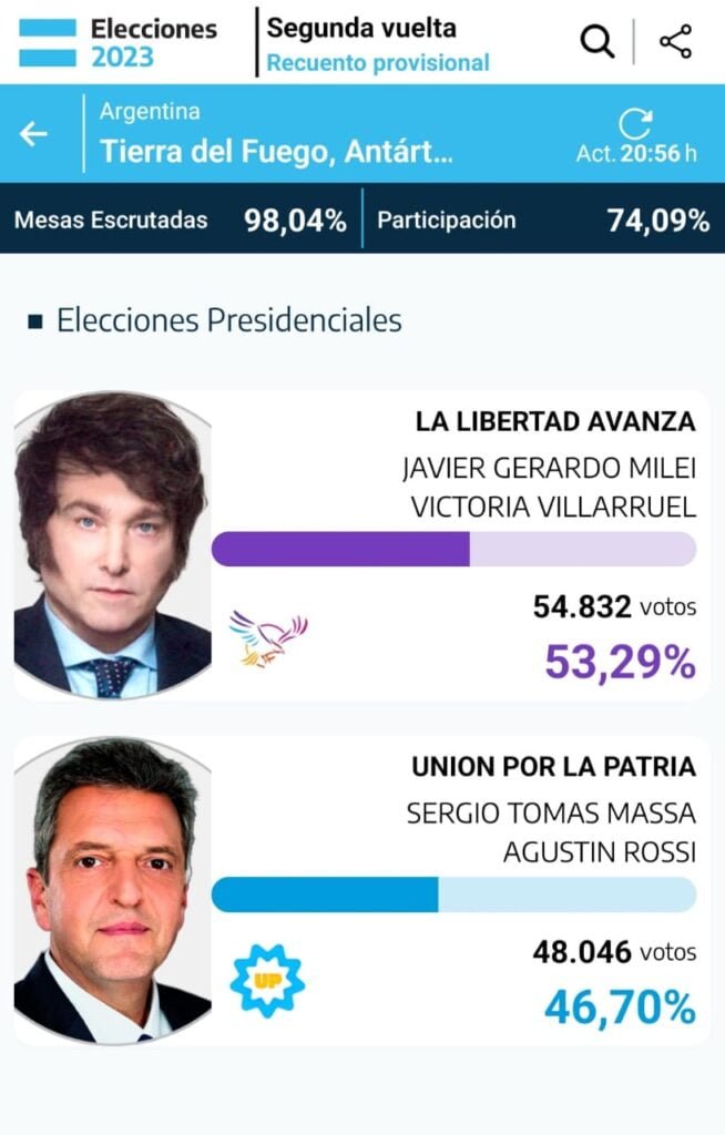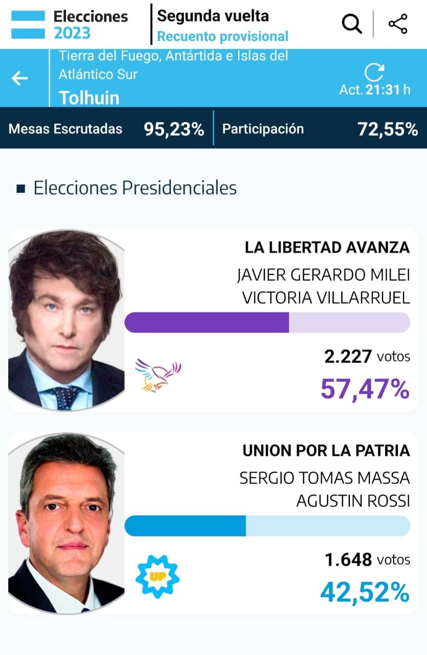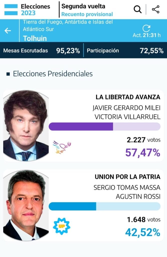 Mientras tanto, en la ciudad de Tolhuin, también se impuso LLA, con 95,23% de las mesas escrutadas, y una participación del 72,55%, con un total de 2.227 votos. De esta Javier Milei, en la localidad mediterránea fue el más votado con el 57,47%, sobre el 42,52% obtenido por la fórmula Massa-Rossi.