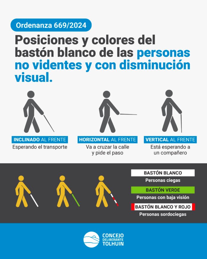 El Concejo Deliberante de Tolhuin aprobó la Ordenanza 669 que instruye al Municipio a crear el Programa Municipal de Cartelería Informativa sobre el uso del bastón por parte de personas no videntes y con disminución visual. Esta iniciativa busca informar a la comunidad sobre los distintos colores y posiciones del bastón, ayudando a mejorar la inclusión y el respeto en la ciudad.