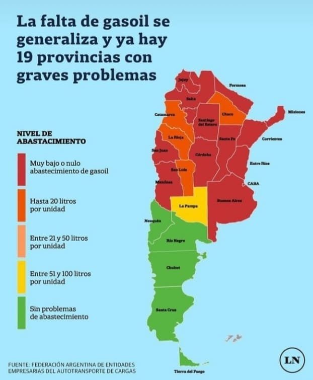 - Catorce provincias en rojo (señala a los sitios en los que hay muy bajo o nulo suministro en las estaciones de servicio): Buenos Aires, Ciudad Autónoma de Buenos Aires, Entre Ríos, Corrientes, Misiones, Santa Fe, Córdoba, Santiago del Estero, Tucumán, Salta, Jujuy, Formosa, San Juan, y Mendoza.