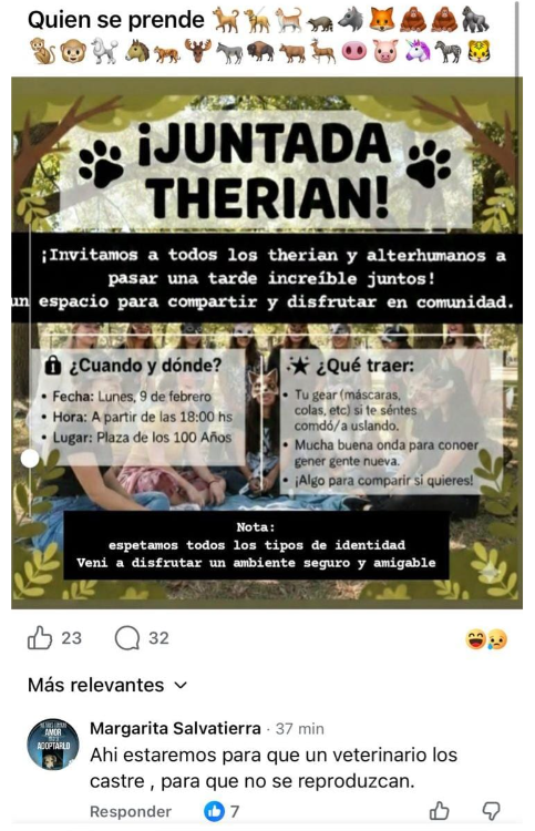 “Invitamos a todos los therian y alterhumanos a pasar una tarde increíble juntos, un espacio para compartir y disfrutar en comunidad”, lanza la convocatoria surgida en redes sociales.