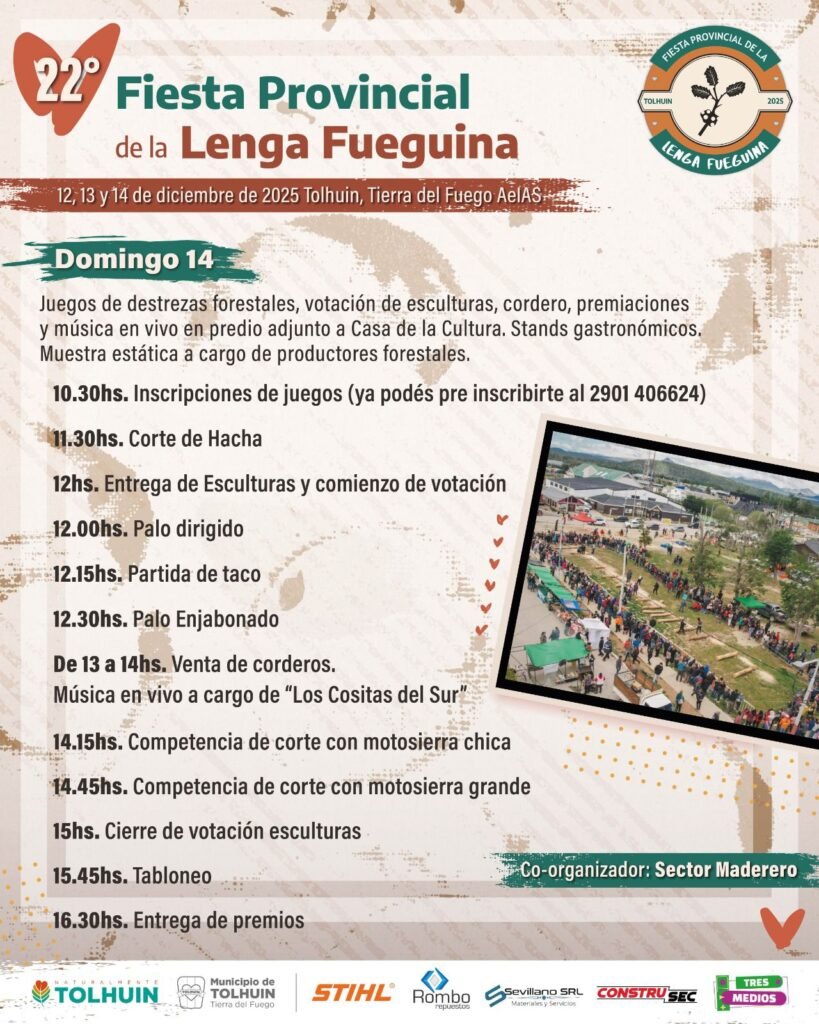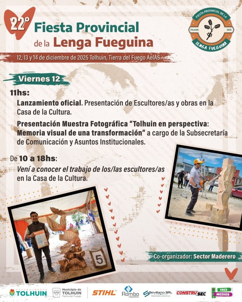 Tolhuin se prepara para vivir una nueva edición de la Fiesta Provincial de la Lenga Fueguina, que se realizará el 12, 13 y 14 de diciembre. Tres jornadas dedicadas al arte en madera, la tradición forestal, la gastronomía local y propuestas culturales para toda la comunidad.